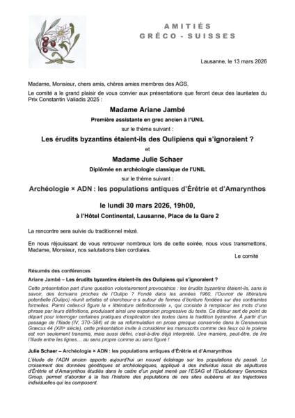 DES SUISSES AU SERVICE DE LA GRÈCE – Conférence à deux voix que donneront Messieurs Yves Gerhard et Olivier Meuwly